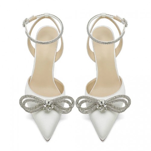 Designer white satin crystal diamante pointed toe strappy high heels for wedding.