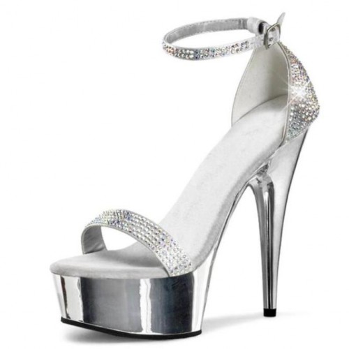 Sexy silver glitter one strap 6 inch high heel sandals with ankle strap and closed back, chrome 1.75 inch platform.