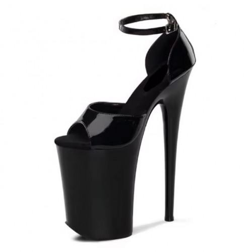 Sexy black patent ankle strap sky high heels, open toe closed back, 8 inch heel 4 inch platform.