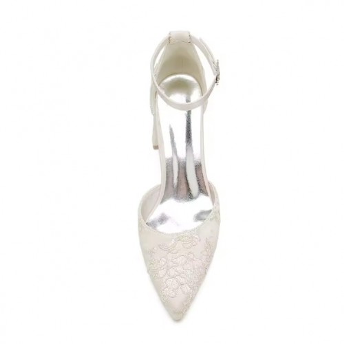 Designer champagne lace/satin closed toe wedding shoes block heel with ankle strap.