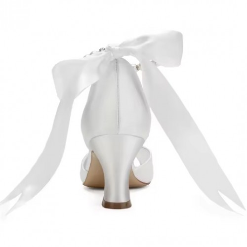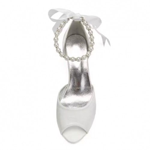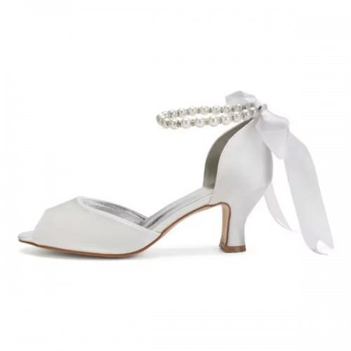 Designer ivory satin peep to low heels with pearl ankle strap for wedding.